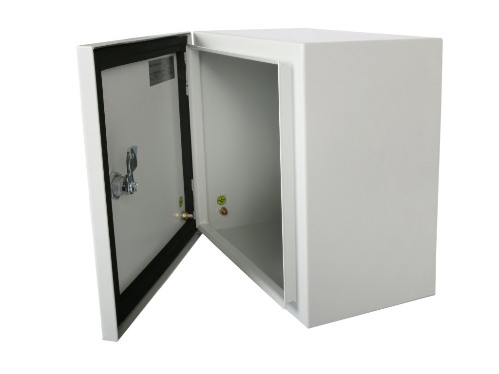 Skříň: oceloplechová, kotvící otvory 10mm. Jednokřídlé dveře, více druhu zámků (půlměsíc, motýlkový EMKA EMKA D5, Těsnící pěnová pryž 15x10 mm po celém obvodu. Povrchová úprava práškovou technologií v odstínu RAL 7032 nebo Černá. Montážní panel pozinkovaný plech s tloušťkou 2,5 mm